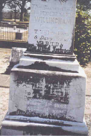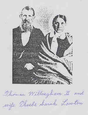 "Sarah and Thomas H. Willingham had one child, a son named Thomas,born December 23, 1798, Santee, South Carolina. When he was only threemonths old his father died, and the widow, Sarah Willingham, marriedElias Gabriel Jaudon (1772-1826) on November 14, 1799, they had tenchilden. My mother often told me how devoted to him was ThomasWillingham's old colored mammy; when she died her last words were,"God bless MarseTommy." I imagine his colored mammy had much to dowith his rearing as his young mother married for the second time whileshe was still in her teens and he less than a year old. His nurse'sprayers were answered, for God blessed him greatly. On November 13,1823. Thomas married Phoebe Sarah Lawton. He moved to Savannah, wherehe was a cotton merchant, but his health became impaired and on theadvice of his physician he located in the country. He had plantationsfrom the rice fields of South Carolina to the sea island cotton landsof South Georgia. All of his plantations were well improved, hospitalsprovided for the sick, and everything conducted in the most orderlyand methodical manner. He was a kind master to his slaves; there wasan attachment existing between master and mistress and their slaveswhich one who had never borne such a relationship could everunderstand. Thomas Willingham built his home, a lovely oId house atLena, South Carolina, long before the War Between the States, whichwas burned by Sherman's army in 1864; he rebuilt it but that house wasalso burned bv fire caused by a defective flue in 1930. His grandson,Thomas Oregon Lawton. who was my father's first cousin, writes me in1941, "All evidence of Grandfather's handiwork has gone except the oldhewn timber barn on one side of which a hole was cut through whichWheeler's cavalrymen loaded corn as they passed through, ahead of, orbehind Sherman's army." Thomas Willingham died Julv 7, 1873, atAllendale and is buried in the old Lawtonville Baptist Churchcemetery. He was a deacon in this church for over fifty years. In hishome no day was ever begun without the family gathering for prayer atwhich a chapter in the Bible was read, a custom which was kept up bymany of his descendants. He had seven sons, five of whom fought forthe Confederacy, and four daughters. His second son, Benjamin LawtonWillingham, my grandfather, was born at Beaufort, South Carolina, onApril 21, 1829. and died at Macon, Georgia, February 17, 1898. He waseducated at The Citadel, Charleston, later spent one year at MadisonCollege, now Colgate University. While attending The Citadel he metElizabeth Baynard"
