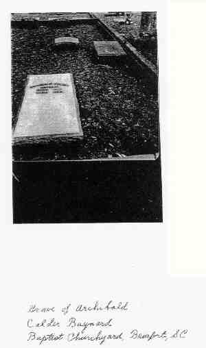 126. Archibald Calder Baynard, son of Thomas Baynard 1,2 and Sally* Calder,1,2 was born in 1797 in Edisto Island, Charleston, South Carolina,1,2 died in 1865 in Jerico Place near Beaufort, SC1,2 at age 68, and was buried in Beaufort Baptist Cemetary.2 Another name for Archibald was Archibald Calder* Baynard 1.,2